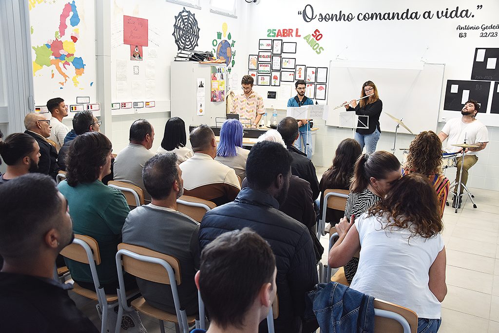 A sala onde os reclusos têm aulas do primeiro ciclo acolheu, na manhã da passada sexta-feira, uma atividade diferente. Ao invés da professora, em frente ao quatro estavam quatro músicos do Conservatório das Caldas da Rainha que deram um concerto de jazz para uma sala repleta. “Blue Bossa”, “All The Things you Are”, “Michelle”, “My Favorite Things” ou “Yesterday”, foram alguns dos êxitos musicais tocados Bernardo Mendes (piano), Luís Coelho (saxofone), Luís Pereira (bateria) e Cristiana Moreira (flauta) que, face ao entusiasmo do público, ainda tocaram um encore: Take Five.