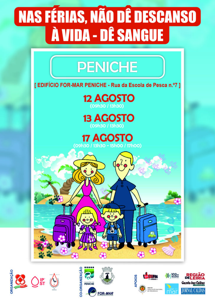 Em Agosto realizam-se três recolhas de sangue em Peniche e duas na Foz do Arelho. Sob o mote “Nas férias, não dê descanso à vida – dê sangue”, estas campanhas são organizadas Associação de Dadores Benévolos de Sangue de Peniche e pelo Centro Social e Recreativo da Foz do Arelho e Associação para o Desenvolvimento Turístico da Foz do Arelho, em parceria com a Federação Portuguesa de Dadores Benévolos de Sangue (FEPODABES) e Instituto Português do Sangue e da Transplantação (IPST).