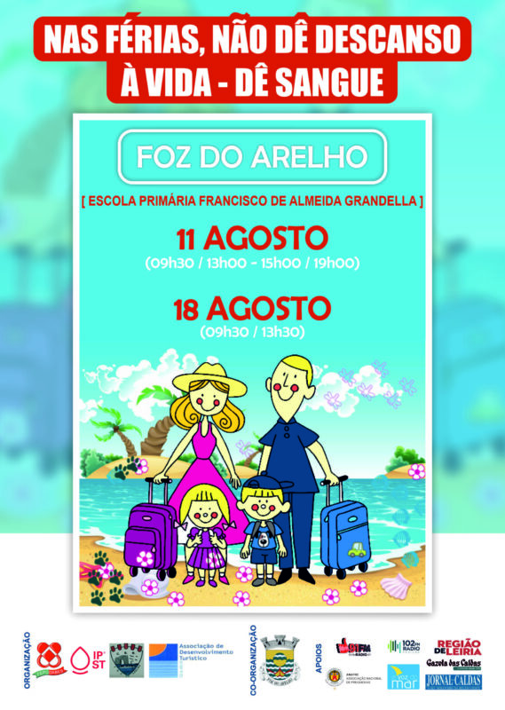 Em Agosto realizam-se três recolhas de sangue em Peniche e duas na Foz do Arelho. Sob o mote “Nas férias, não dê descanso à vida – dê sangue”, estas campanhas são organizadas Associação de Dadores Benévolos de Sangue de Peniche e pelo Centro Social e Recreativo da Foz do Arelho e Associação para o Desenvolvimento Turístico da Foz do Arelho, em parceria com a Federação Portuguesa de Dadores Benévolos de Sangue (FEPODABES) e Instituto Português do Sangue e da Transplantação (IPST).
