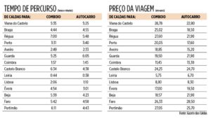 O autocarro é genericamente mais rápido do que o comboio, mas nem sempre é o mais barato. Desde as Caldas da Rainha para 14 cidades do Minho ao Algarve, a Rede de Expressos é mais rápida em 11 viagens, conseguindo a CP ser competitiva apenas para Braga, Porto e Guarda. Já no que diz respeito aos preços há um empate: a Rede de Expressos é mais barata para sete destinos e a CP consegue preços mais baixos para outros sete.
