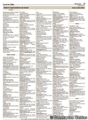 Neste momento apenas incluímos restaurantes dos concelhos das Caldas da Rainha, Óbidos, Alcobaça e Peniche. Caso algum restaurante que seja assinante da Gazeta das Caldas não tenha sido incluído nesta lista, deve contactar-nos imediatamente para que no próximo trimestre seja incluído.Gazeta das Caldas quer desta maneira testemunhar a sua solidariedade com este sector de actividade que é tão representativo da cultura e das tradições locais e que pode estar em vésperas de ser atingido com um rude golpe com o aumento da taxa de IVA para os 23%.