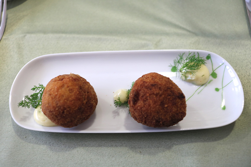 Em cima da mesa havia imagens da Sé da Catedral do Porto e do Castelo de Guimarães. Primeiro foram servidos croquetes de cabeça de porco, com a consistência certa, acompanhados com endros (erva aromática com sabor de anis e um toque de limão).