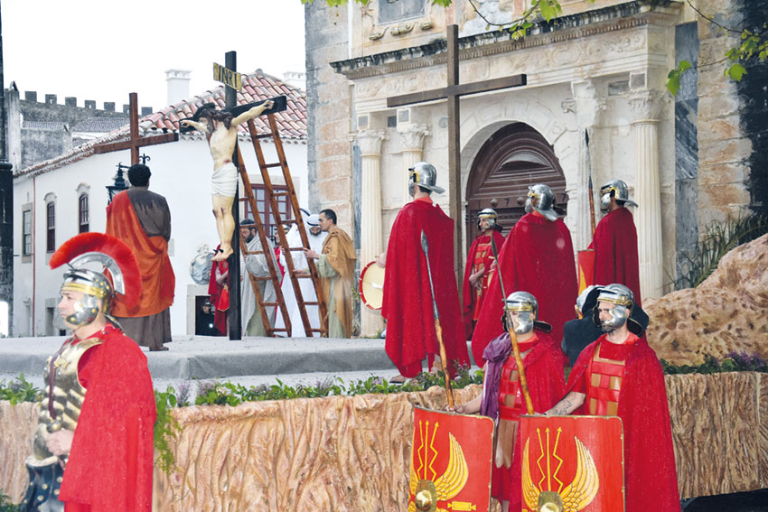 Ao final da tarde de sexta-feira, 29 de março, chovia copiosamente na vila de Óbidos. Ainda assim, a organização da Semana Santa decidiu avançar com a representação do Auto do Descimento da Cruz com dezenas de pessoas a tentar abrigar-se debaixo de alpendres, telheiros e chapéus de chuva para assistir à “teatralização religiosa” representando a retirada do Senhor da Cruz. A última vez que esta celebração aconteceu em Óbidos foi em 2014. Dela fazem parte 30 personagens, entre os quais soldados romanos, amigos de Jesus, as Marias, São João e Nossa Senhora.