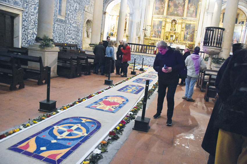 Inicialmente os tapetes seriam colocados na rua mas, por causa do mau tempo, optou-se pelo interior da Igreja de Sta. Maria que acolhe 12 painéis coloridos com símbolos religiosos, associados à Páscoa. Têm início com referências ao Domingo de Ramos e terminam no Domingo de Páscoa, com detalhes dos Bordados de Óbidos.