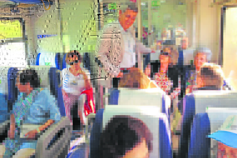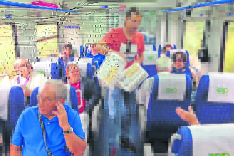 A CP disponibilizou duas automotoras da série 592 atreladas que formaram uma composição de seis carruagens, invulgar na linha do Oeste. A Junta de Freguesia tinha organizado bem a coisa: cada sénior inscrito sabia o número da sua porta e só tinha depois de escolher o lugar. Elementos da autarquia espalharam-se estrategicamente ao longo das carruagens para prestar apoio.