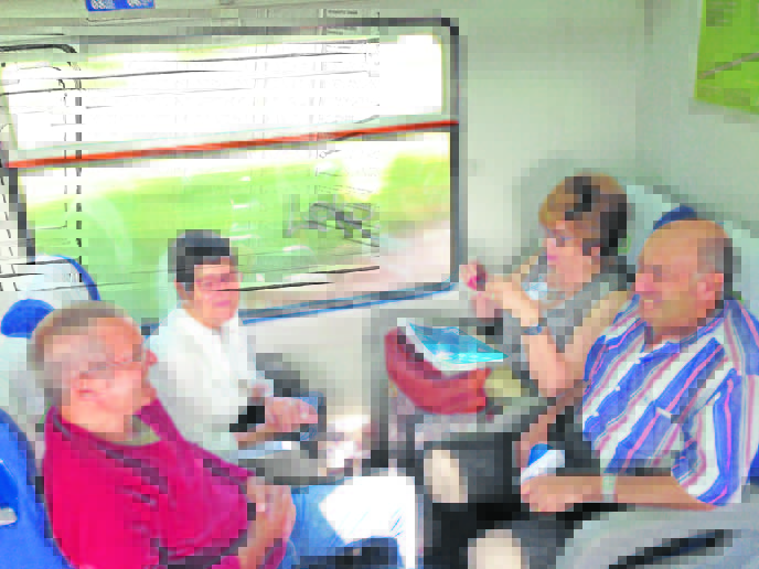 Ao lado, em animada conversa, viajam dois casais amigos: Ester e Gualter Nunes (de 75 e 71 anos, respectivamente) e Paulina e Abílio Reis (de 69 e 74 anos). Todos estão de acordo: “isto de comboio é muito melhor do que de autocarro”. Gualter Nunes diz que já não andava de comboio há mais de 40 anos e a esposa sublinha que “isto é bom porque dá para esticar a pernas”. Paulina Reis recorda outra viagem da Junta, também sobre carris, à Figueira da Foz, de que gostou muito e acha que assim “é mais engraçado”, até porque os dois casais vão sentados frente a frente a conviver. Abílio Rodrigues diz que “no comboio temos mais vista e vimos mais coisas”, no que é interrompido pela passagem de um túnel – de repente só se vê a escuridão através da janela e a coincidência provoca risos.
