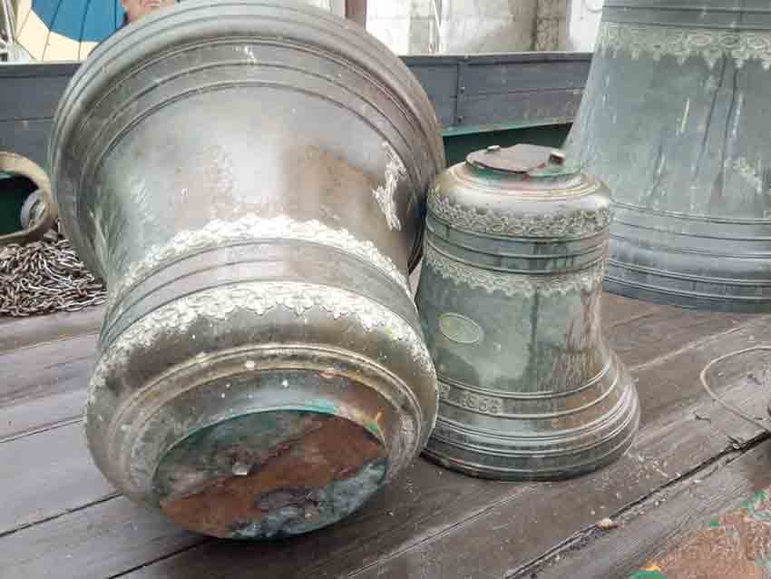 “Um dos sinos estava rachado, outro tinha o badalo estragado e os restantes estavam sob traves de ferro com buracos e muita ferrugem”, disse o padre Joaquim Pedro, responsável pela paróquia à Gazeta das Caldas, acrescentando que era urgente investir na recuperação dos sinos, que acusavam um desgaste acentuado que se podia constatar na corrosão das traves de suporte.