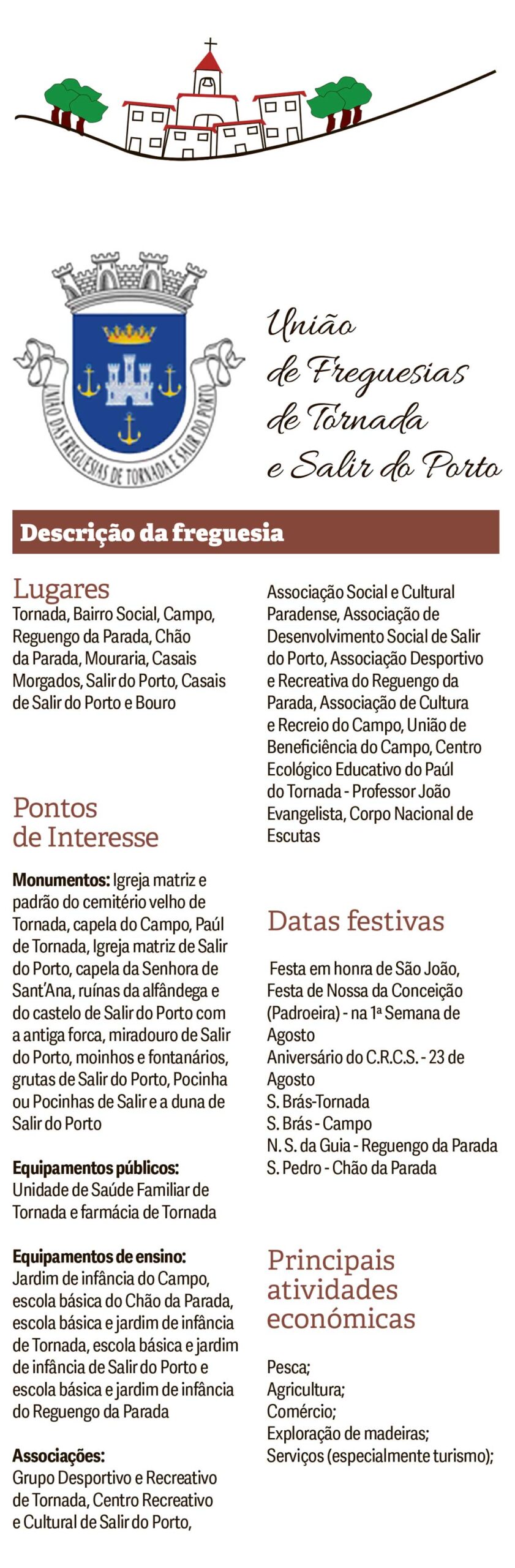 A União de Freguesias de Tornada e Salir do Porto tinha nos últimos Censos (2011) 4358 habitantes, numa área de 29,53 km². Esta União nasceu da reorganização administrativa de 2012 e 2013, agregando as duas freguesias. Mas a história da ocupação humana na zona destas duas antigas freguesias remonta a muito antes disso, antes até da fundação da nacionalidade. Existem registos que atestam a presença romana nesta região.
