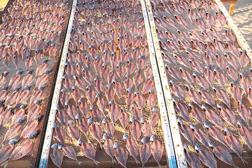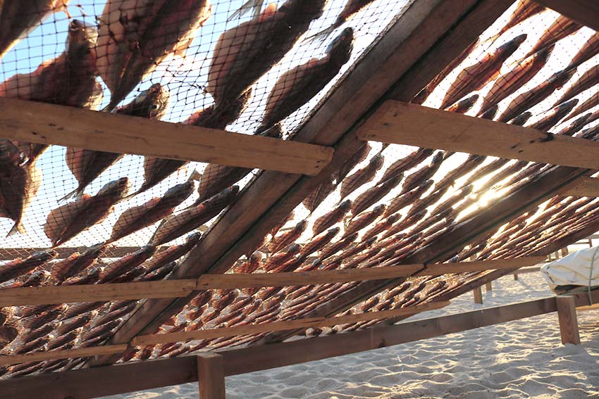 Por trás de cada uma das peixeiras, vê-se uma fila de cerca de 20 metros, com uma estrutura em madeira onde assentam mais paneiras com peixe a secar. Por cima, uma rede protege o peixe seco dos ataques das gaivotas.