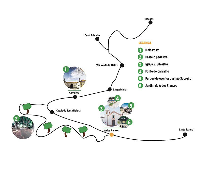 Casal da Pedra, Broeiras, Casal Sobreiro, Vila Verde de Matos, Salgueirinha, Carreiros, Casais de Santa Helena, A dos Francos, Casais Paraventa, Casal da Mata Velha, Casal Vale Covo, Casal da Palmeira, Casal Pinheiro, Casal das Sesmarias, Casais da Bica, Casais Gaiolas, Casais da Aramenha, Santa Susana e Casal das Cheiras