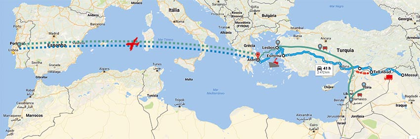 Da Síria caminhou dois dias até à fronteira com a Turquia, que atravessou a fugir das balas. Depois de 10 dias na Turquia, pagou 1.700 dólares ao dono de um barco que o levaria até à ilha de Lesbos, na Grécia.