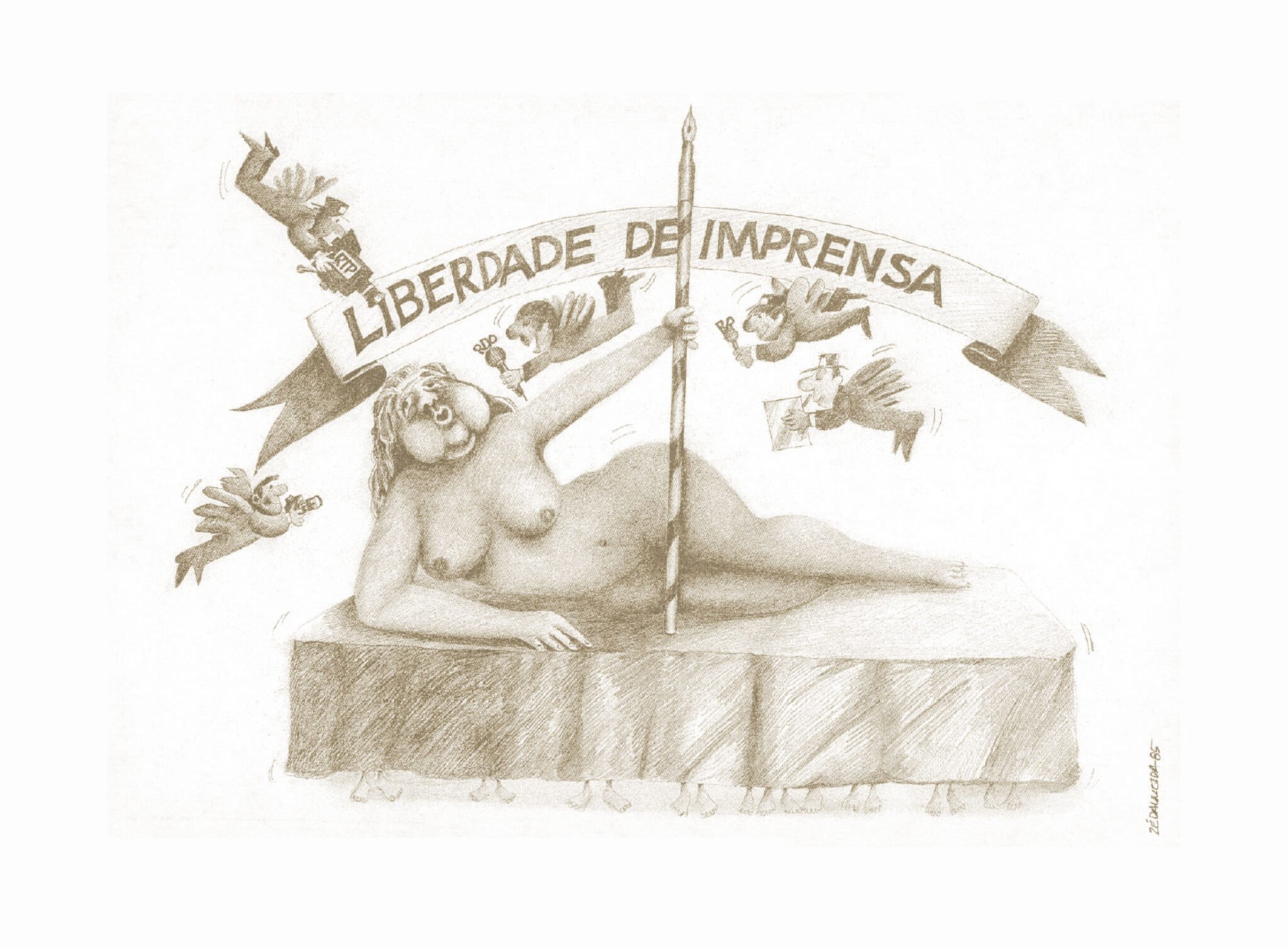 Publicamos nesta evocação vários cartoons que assinou ao longo da carreira. E destacamos um cartoon que Zé d’Almeida dedicou ao tema da liberdade de imprensa, com recurso à figura emblemática do Zé Povinho.