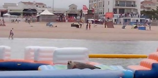 A baía de São Martinho tem uma nova e inesperada atracção. Na passada semana uma foca escolheu o parque de insufláveis instalado na baía...