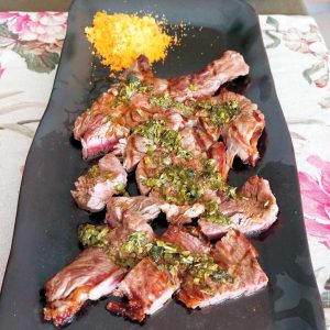 O chef prima por condimentar os grelhados com molhos à base de ervas aromáticas que confeciona, como o molho chimichurri, originário do Uruguai e da Argentina e muito usado no sul do Brasil para adicionar alguma acidez à carne, cortando a gordura em que é rica.