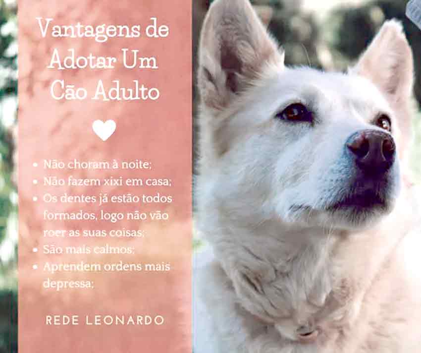 Adoptar um cão adulto tem várias vantagens. Não choram à noite, não fazem xixi em casa e os dentes já estão formados, logo não vão andar a roer as suas coisas. Além disso são mais calmos e aprendem as ordens mais depressa. Rede Leonardo 917412495